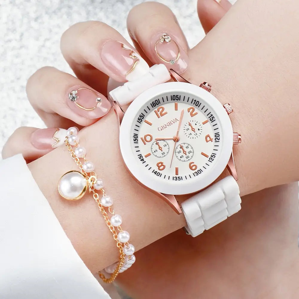 Versatility: Seamlessly transition from day to night with our versatile collection, featuring a watch, ring, necklace, earrings, and bracelet.
